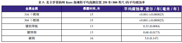 表3至表6的數據來自于日本、巴拿馬、Kure 海灘(北卡萊羅納州)和南非的試驗地點。可利用這些數據在類似環境中選擇適當的金屬材料,進行生命周期成本分析。