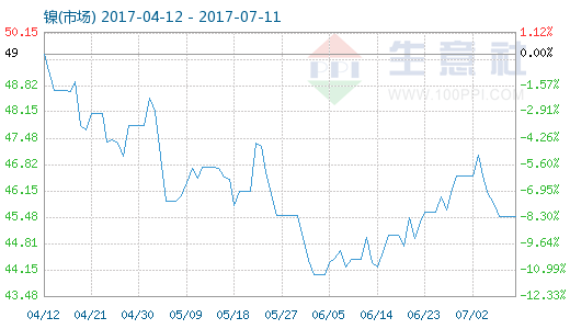 7月11日鎳(市場)商品指數為45.45,較昨日下降了0.05點,較周期內最高點100.00點(2011-09-01)下降了54.55%,較2015年11月24日最低點39.05點上漲了16.39%。(注:周期指2011-09-01至今)